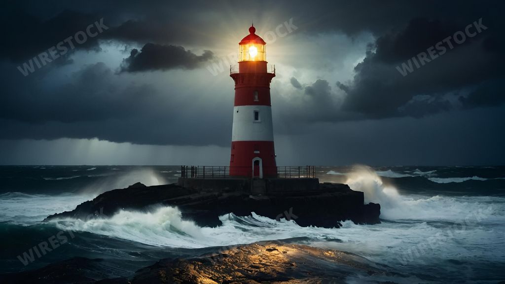 Media type: IllustrationDescription: An AI generated illustration of A dramatic view of a lighthouse illuminating during a stormy night with waves crashing against the rocks.
