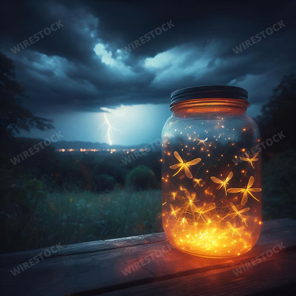 Amy in RL | A glowing jar of fireflies on a wooden table with a stormy sky and lightning in the background.