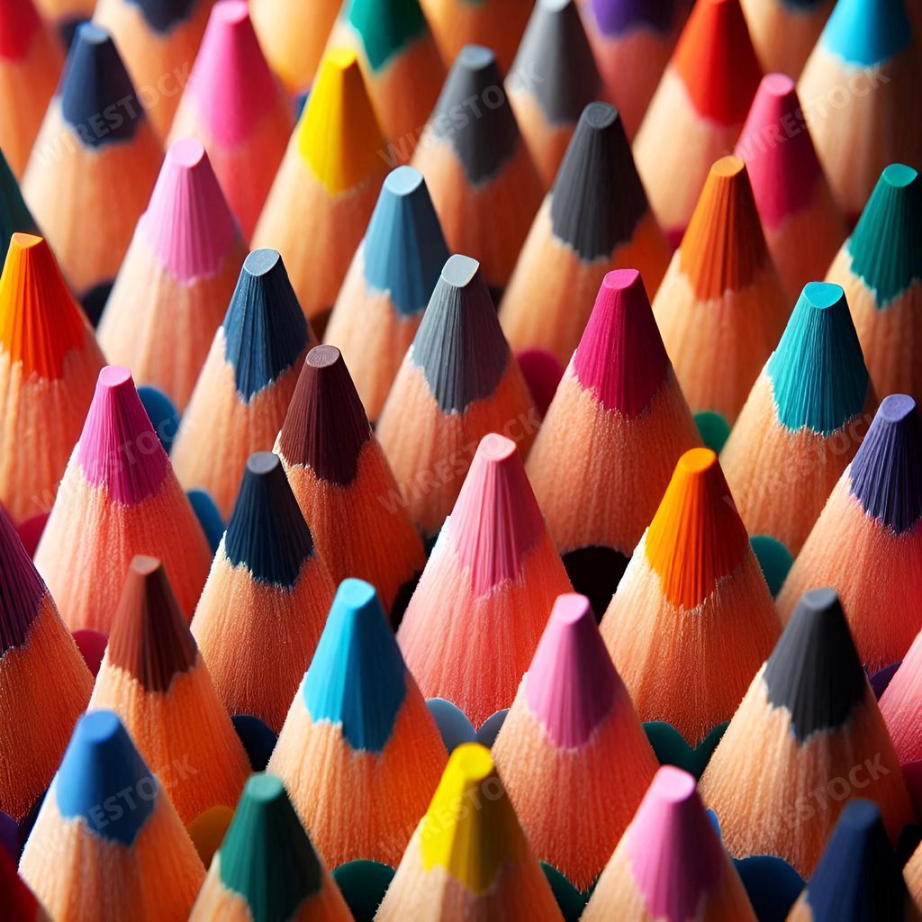 Media type: IllustrationDescription: An AI generated illustration of Close-up of colorful sharpened pencil tips arranged in a pattern.
