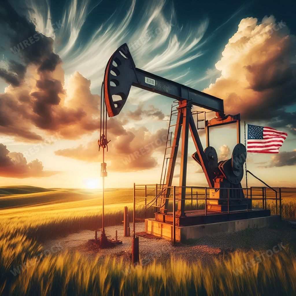 Amy in RL | Oil pump jack in a golden wheat field at sunset with an American flag, dramatic sky with clouds.
