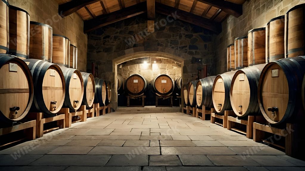 Amy in RL | A well-lit wine cellar with rows of wooden barrels and stone walls.