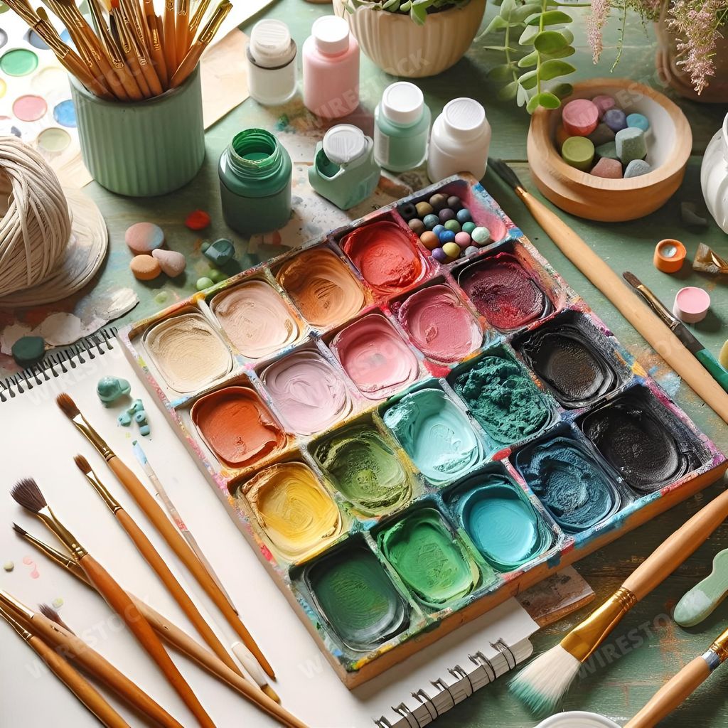 Media type: IllustrationDescription: An AI-generated illustration of a paint palette, brushes, and art supplies on a wooden table.