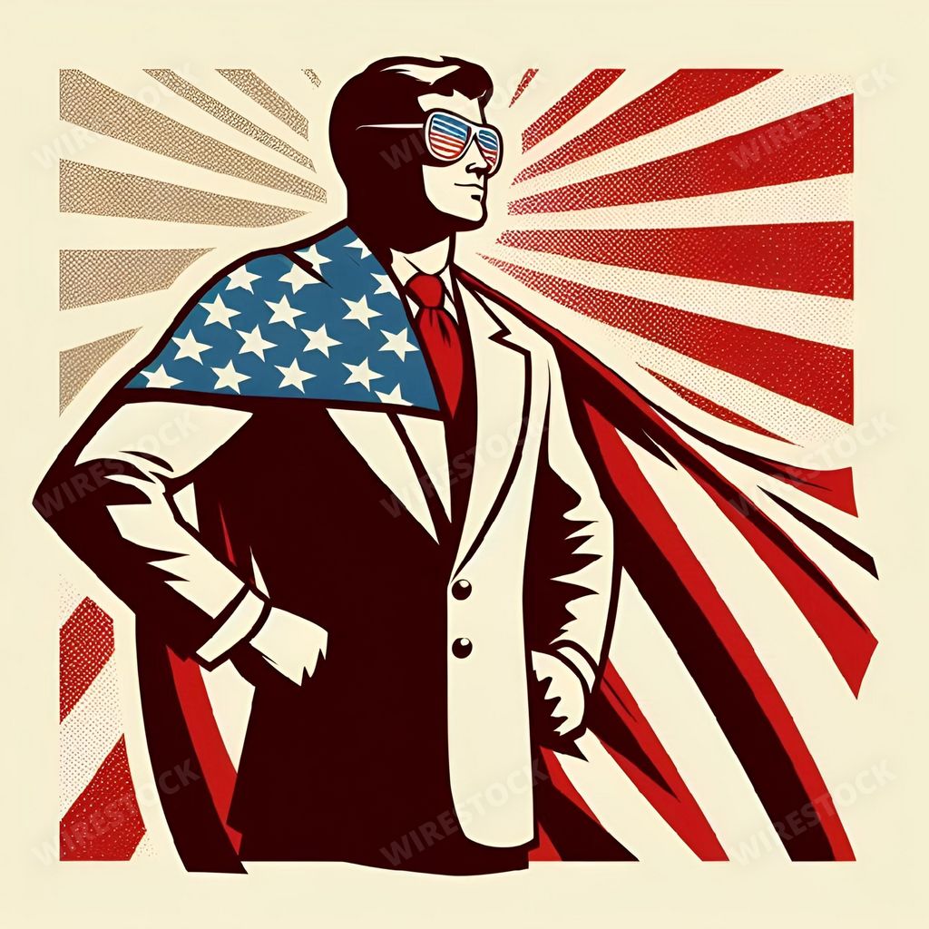 Amy in RL | Retro illustration of a man in a suit with an American flag cape and sunglasses, symbolizing patriotism and strength