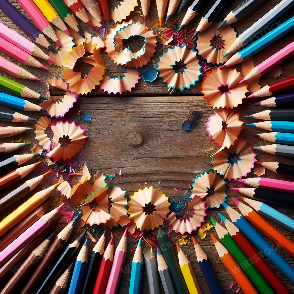 Amy in RL | Colorful arrangement of sharpened pencils and shavings on a wooden surface