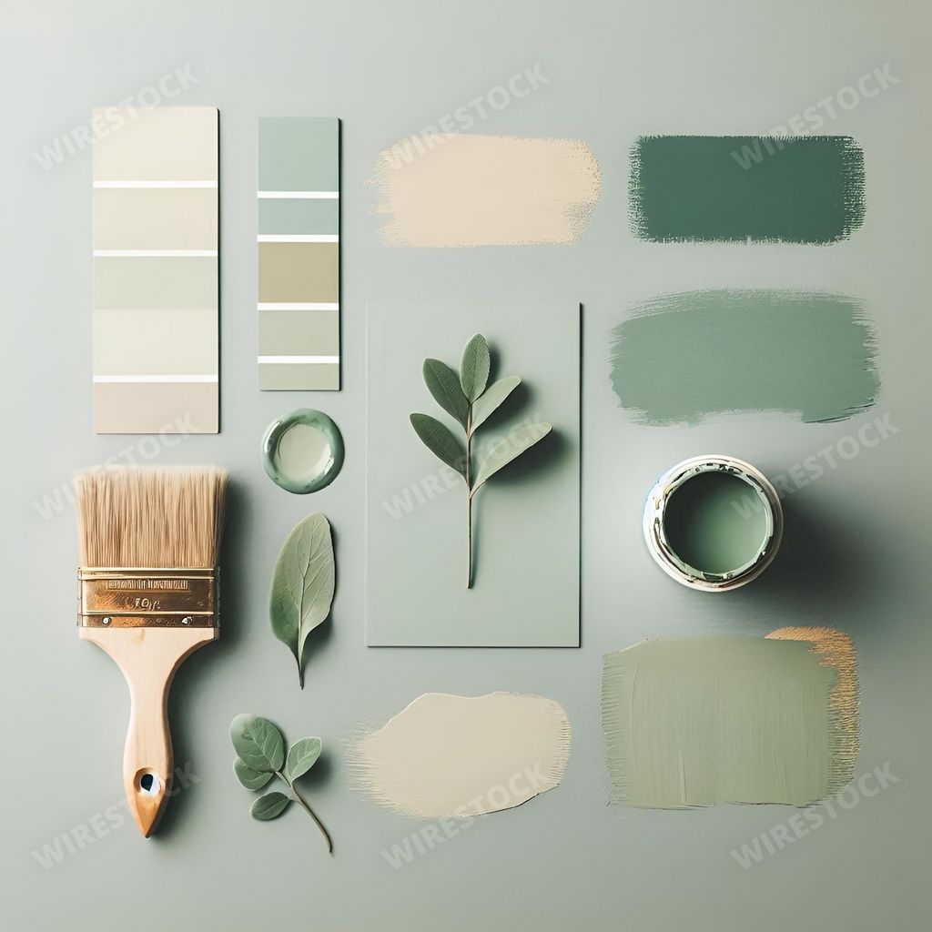 Amy in RL | Flat lay of paint swatches, a brush, and leaves arranged aesthetically on a light green background.