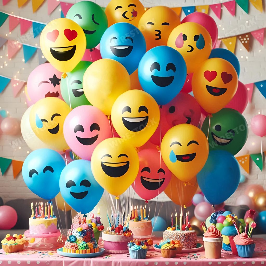 Amy in RL | Colorful birthday party setup with emoji balloons, cakes, and cupcakes.
