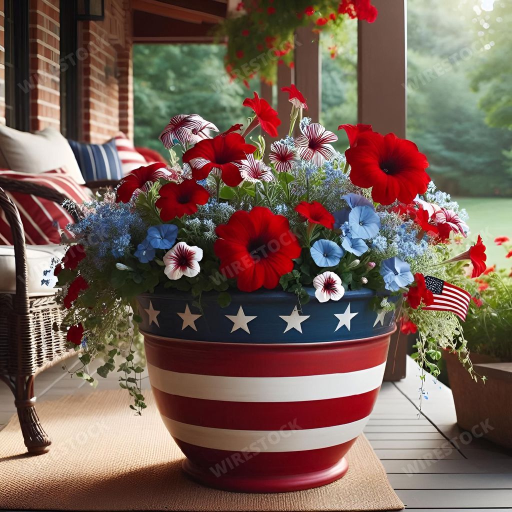 Amy in RL | Patriotic flower arrangement in a star-spangled pot on a porch, with red, white, and blue flowers