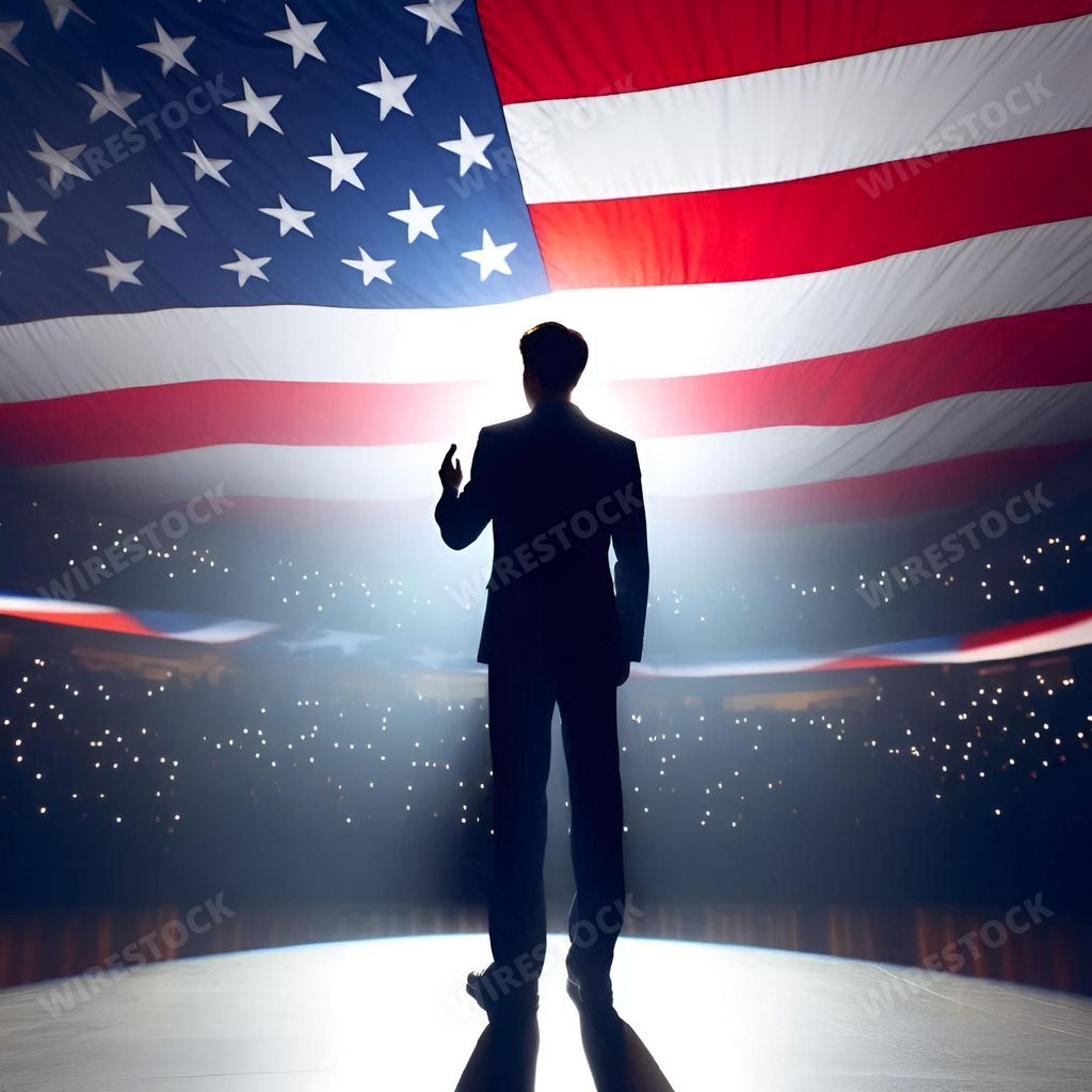 Amy in RL | Silhouette of a man giving a speech in front of a large American flag with a crowd in the background