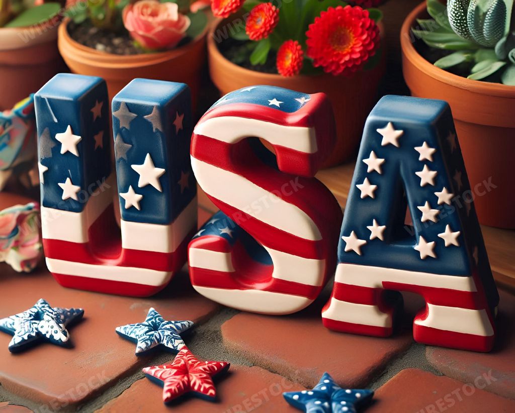 Amy in RL | Patriotic USA letters decorated with American flag colors, surrounded by potted flowers and star-shaped decorations.