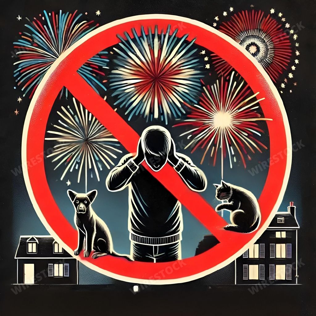 ValHeyrie | Illustration of a person and pets avoiding fireworks with a prohibition sign, highlighting noise pollution and safety concerns.