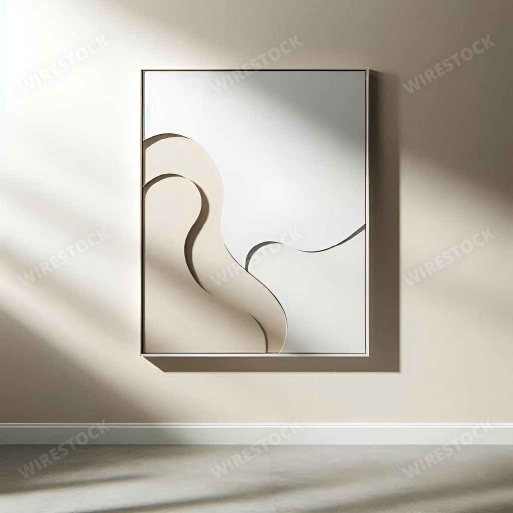 Media type: IllustrationDescription: An AI generated illustration of Minimalist abstract art hanging on a beige wall with soft natural light casting shadows