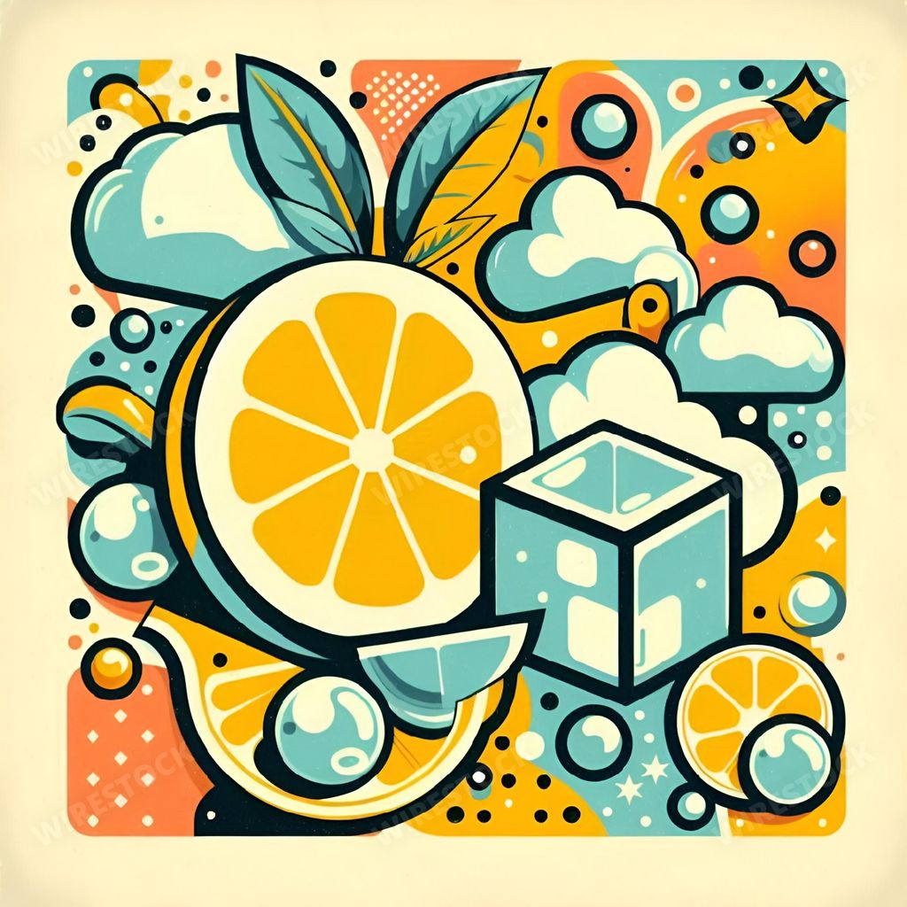 Amy in RL | Colorful pop art illustration of citrus fruits and ice cubes with abstract background
