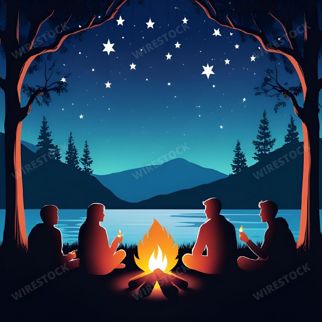 Amy in RL | Illustration of friends sitting around a campfire by a lake under a starry night sky