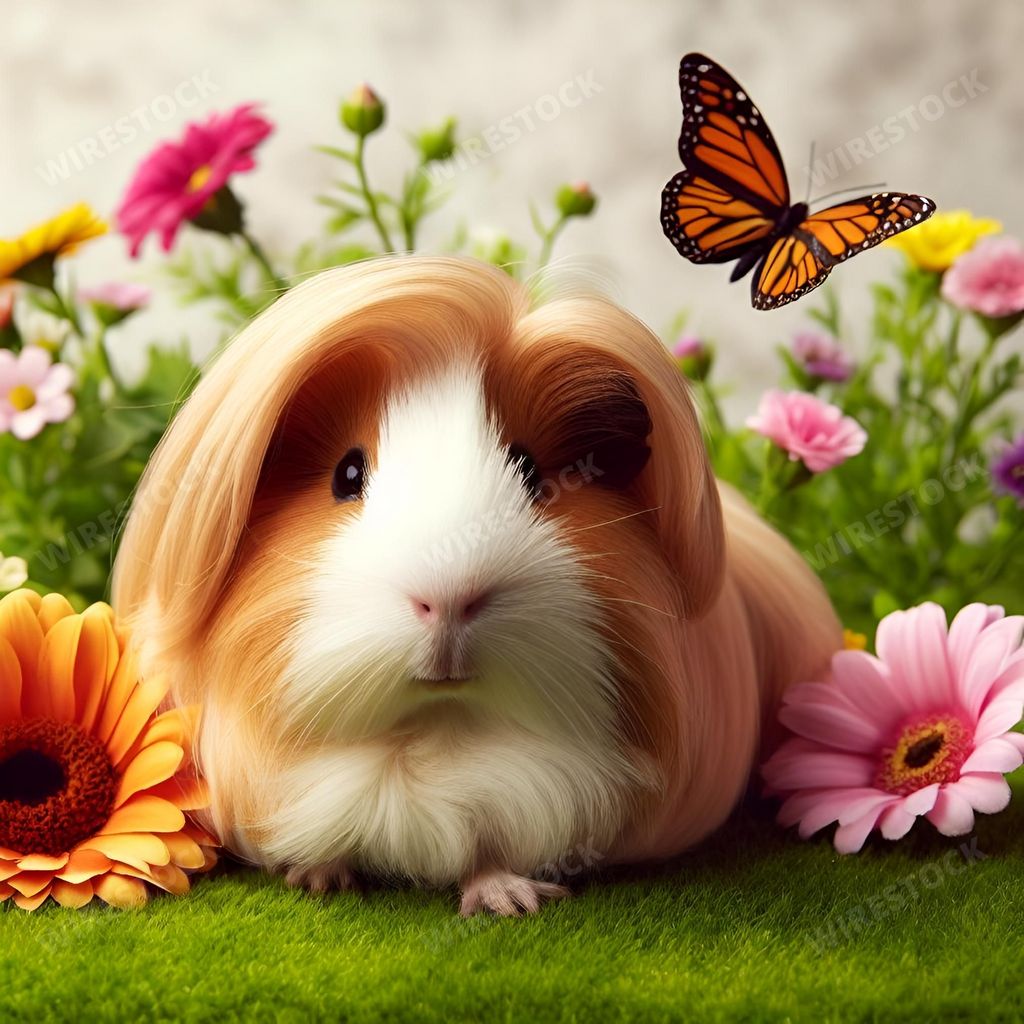 Media type: IllustrationDescription: An AI generated illustration of A cute guinea pig with long hair surrounded by colorful flowers and a butterfly in a garden.