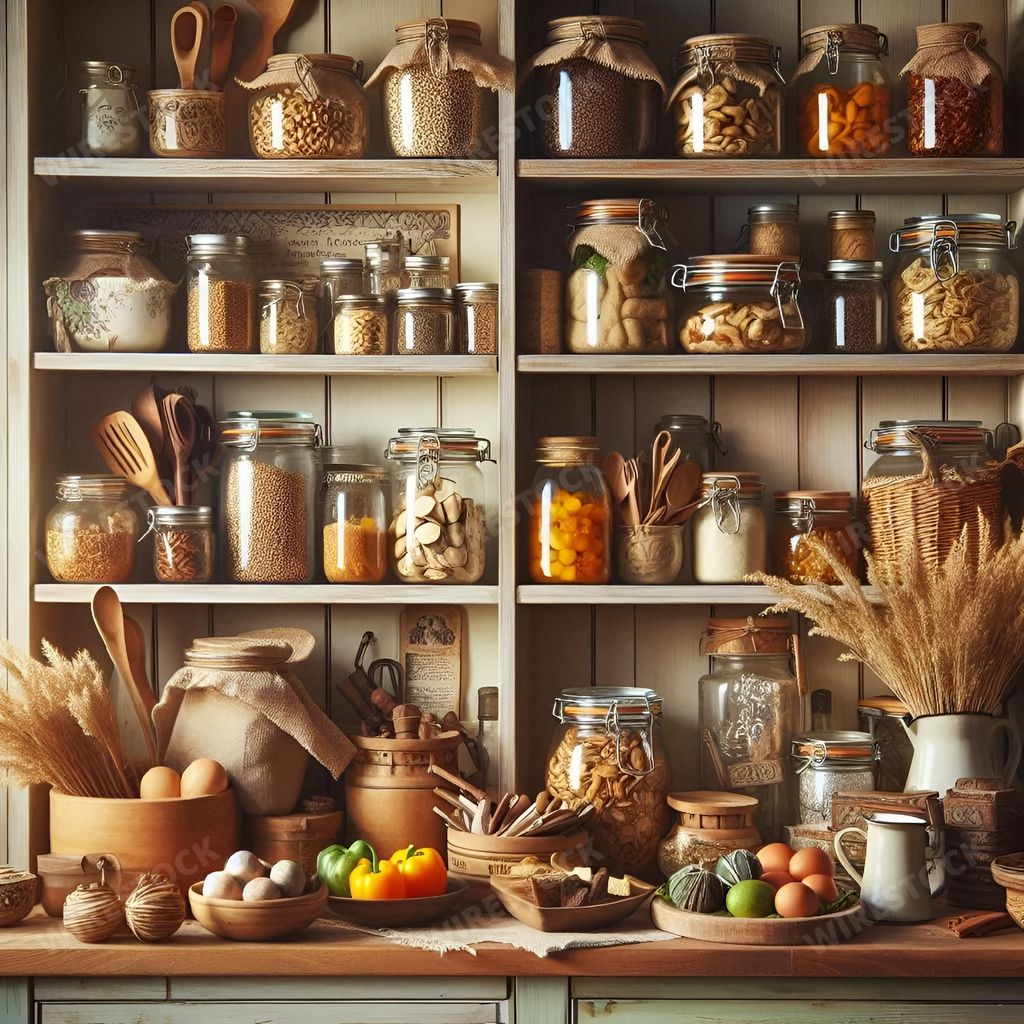 Amy in RL | A rustic kitchen pantry with shelves stocked with various jars of grains, spices, and vegetables