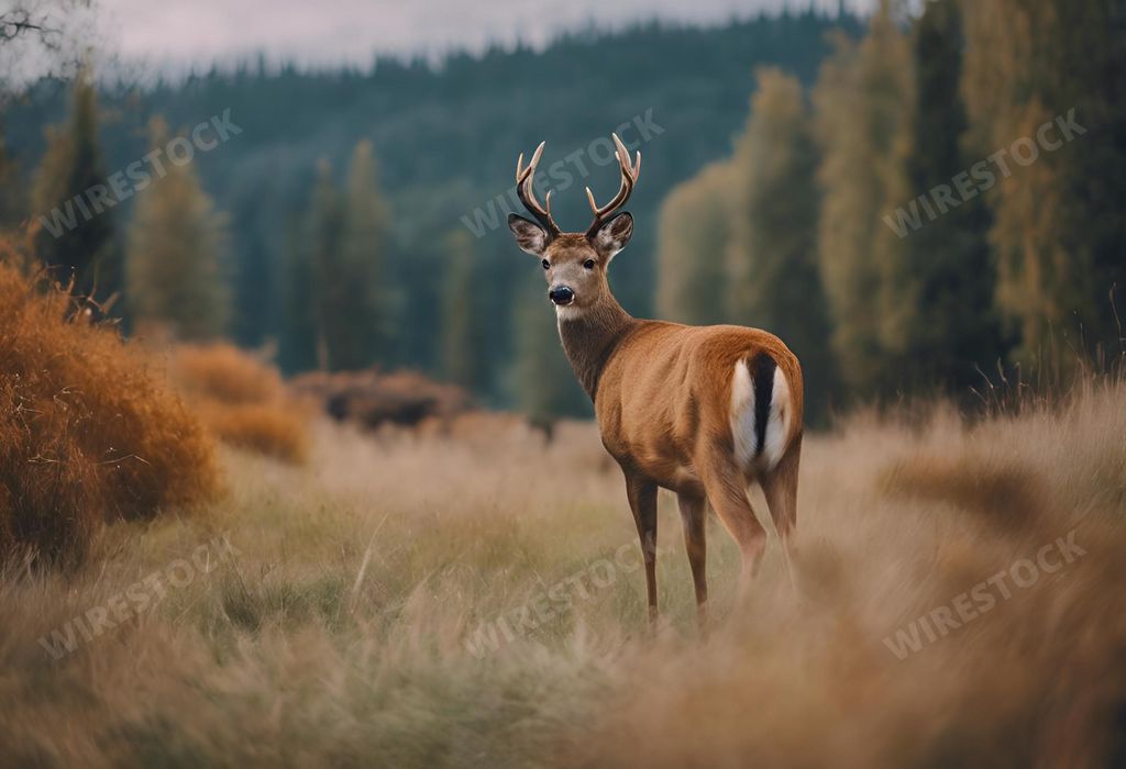 Media type: IllustrationDescription: An AI-generated Deer standing on the grass against a forest background.