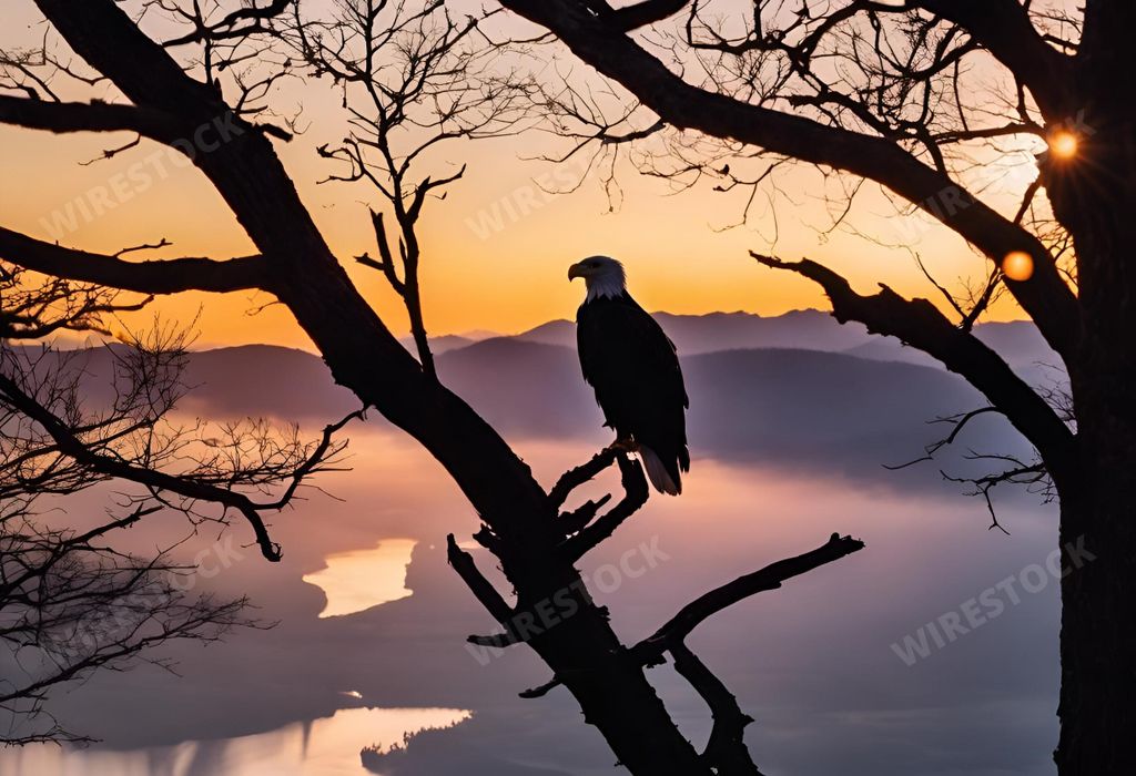 Media type: IllustrationDescription: AI-generated An eagle sitting on a tree with sunset sky in the background