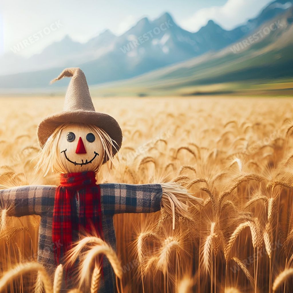 Amy in RL | Cheerful scarecrow in a golden wheat field with mountains.