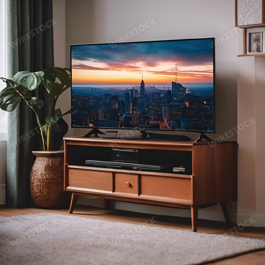 Amy in RL | Modern living room with flat-screen TV and wooden TV stand.