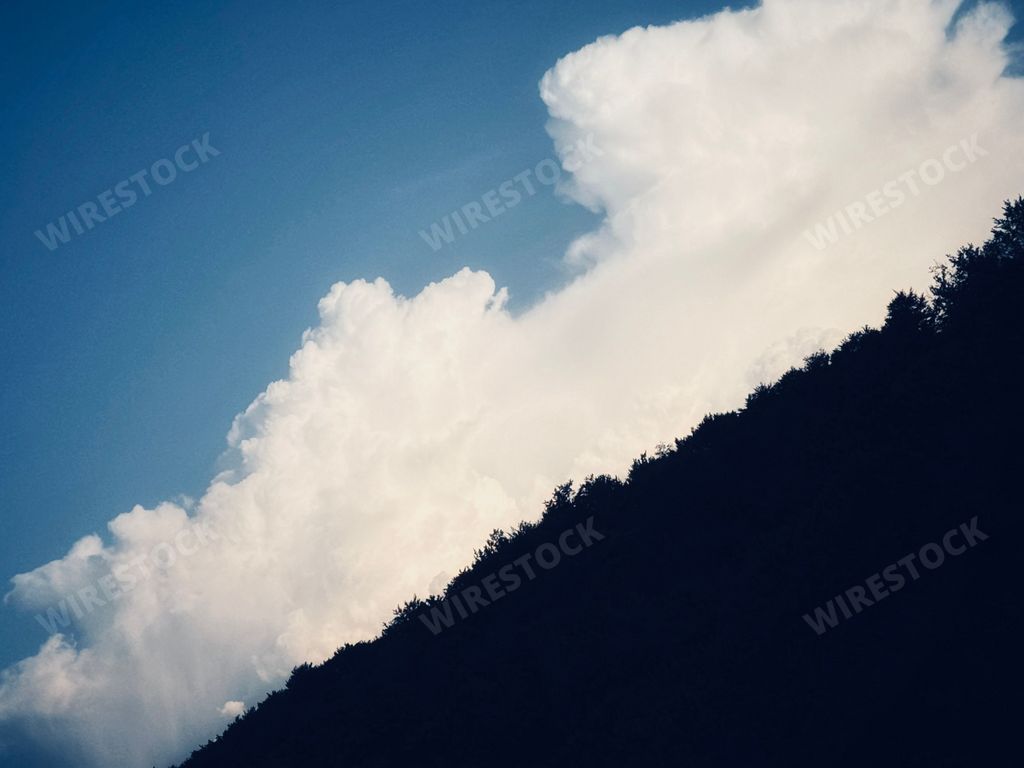 Media type: PhotoDescription: A dramatic landscape featuring a silhouetted mountain against a backdrop of towering white clouds and a bright blue sky.