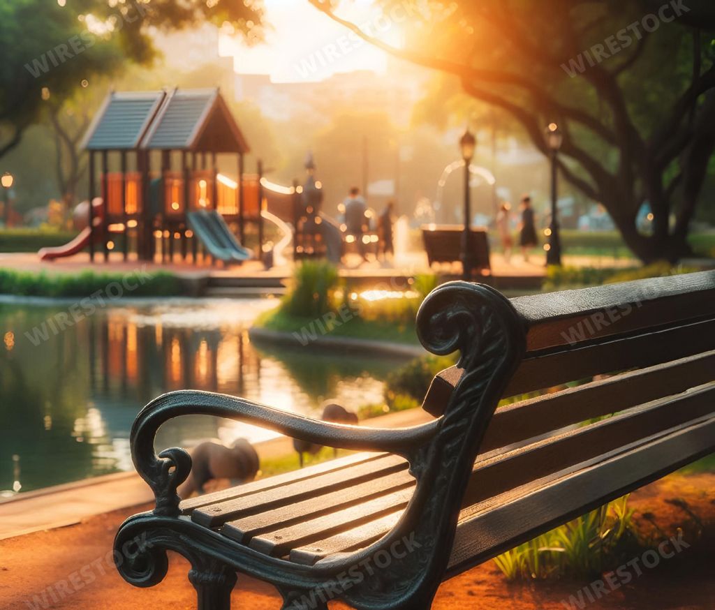 Amy in RL | Sunlit park scene with bench and playground.