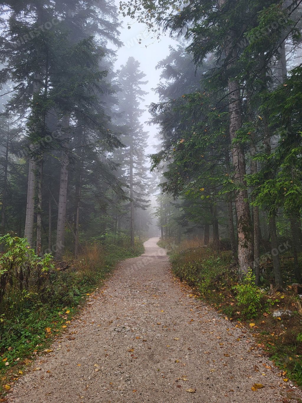 Media type: PhotoDescription: A misty forest path surrounded by tall evergreen trees, creating a serene and mysterious atmosphere in the early morning.