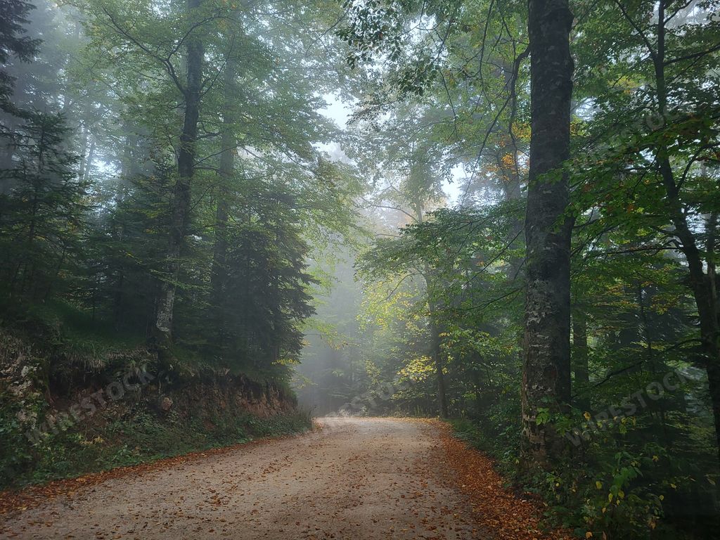 Media type: PhotoDescription: Misty forest path with lush green foliage and a serene atmosphere, capturing the essence of a tranquil woodland scene.