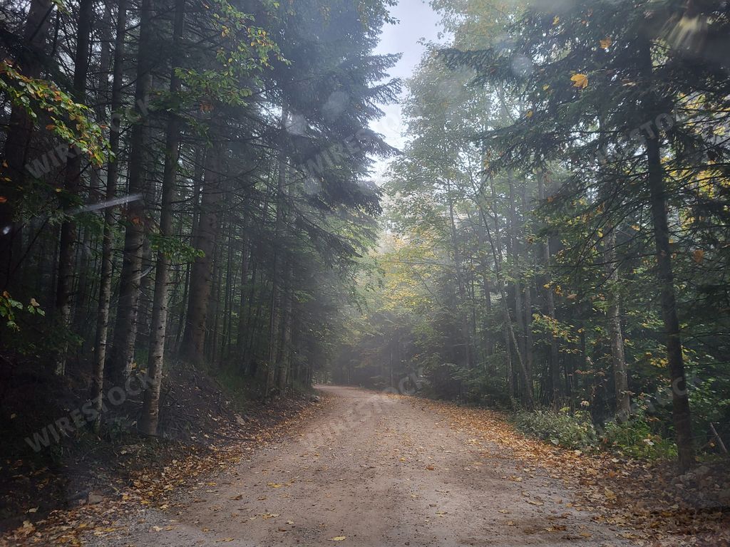 Media type: PhotoDescription: A serene forest path in autumn with mist and fallen leaves, creating a tranquil atmosphere.