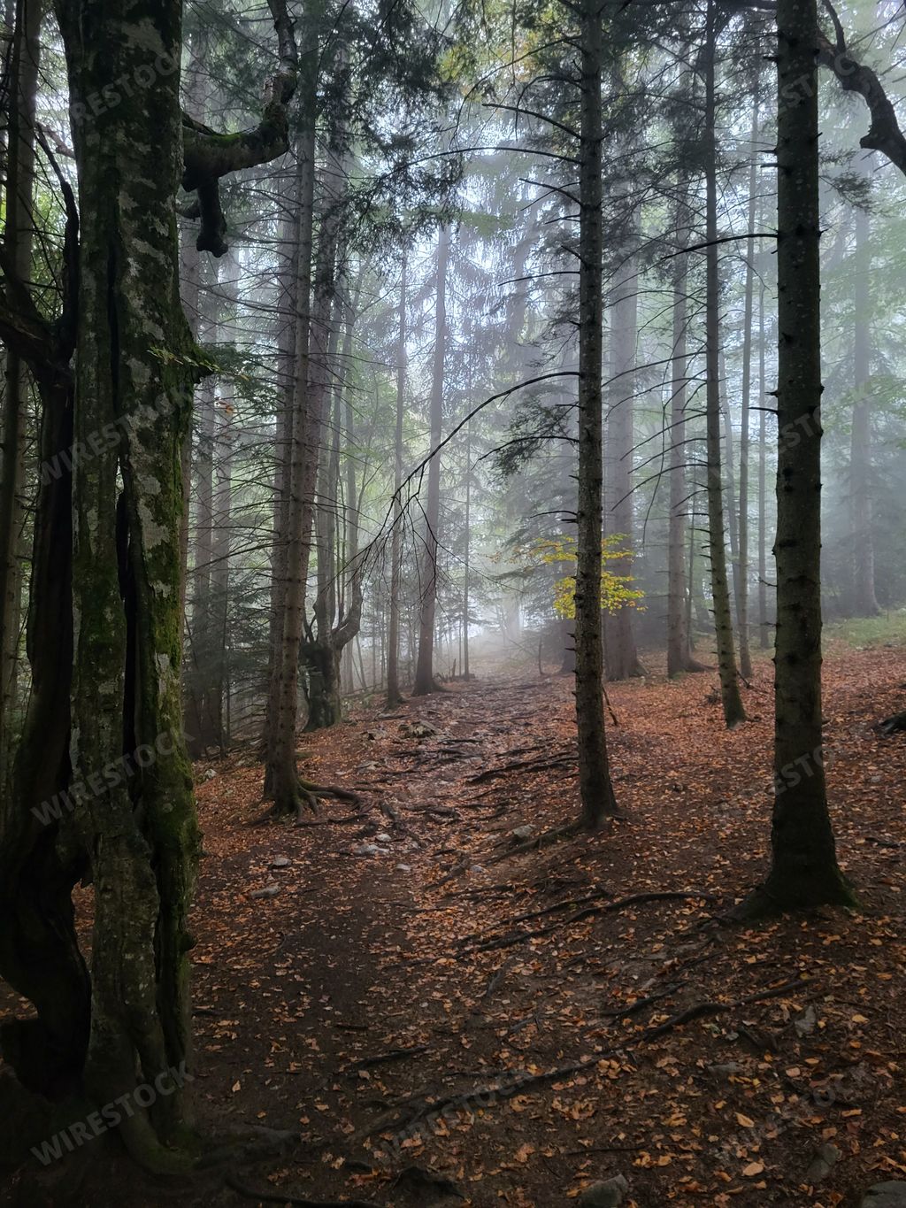 Media type: PhotoDescription: Misty forest trail with fallen leaves and towering trees, creating an atmospheric and serene natural scene.