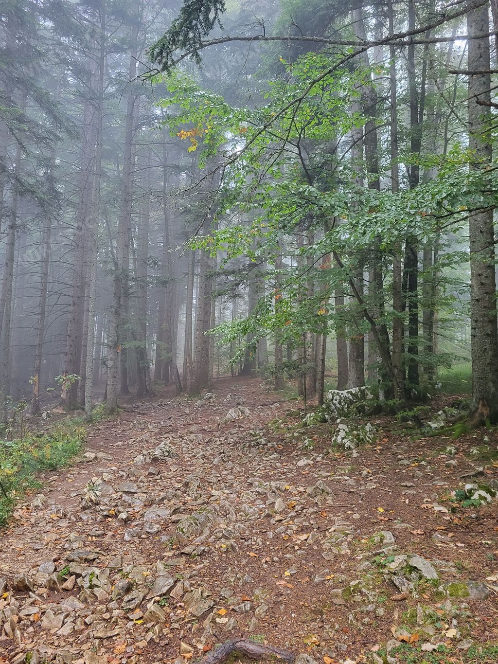 Media type: PhotoDescription: Misty forest pathway with lush green foliage and rocky terrain, creating a serene and mysterious atmosphere.