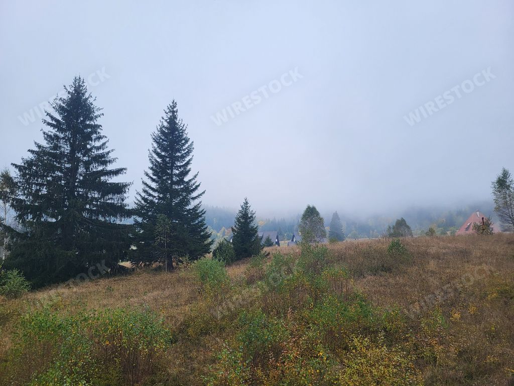 Media type: PhotoDescription: Foggy landscape with pine trees and a distant house on a misty morning, capturing the serene atmosphere of a rural setting.