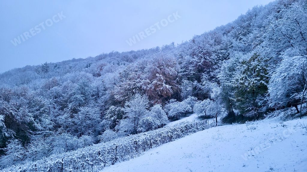 Media type: PhotoDescription: A serene winter landscape showcasing a snow-covered forest on a hillside under a pale blue sky.