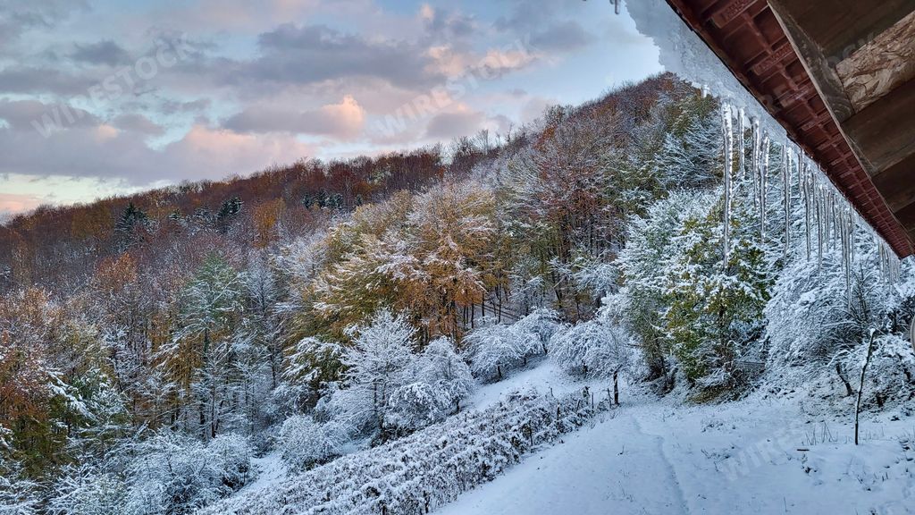 Media type: PhotoDescription: A scenic winter landscape with snow-covered trees and icicles hanging from a roof, set against a colorful autumn forest.