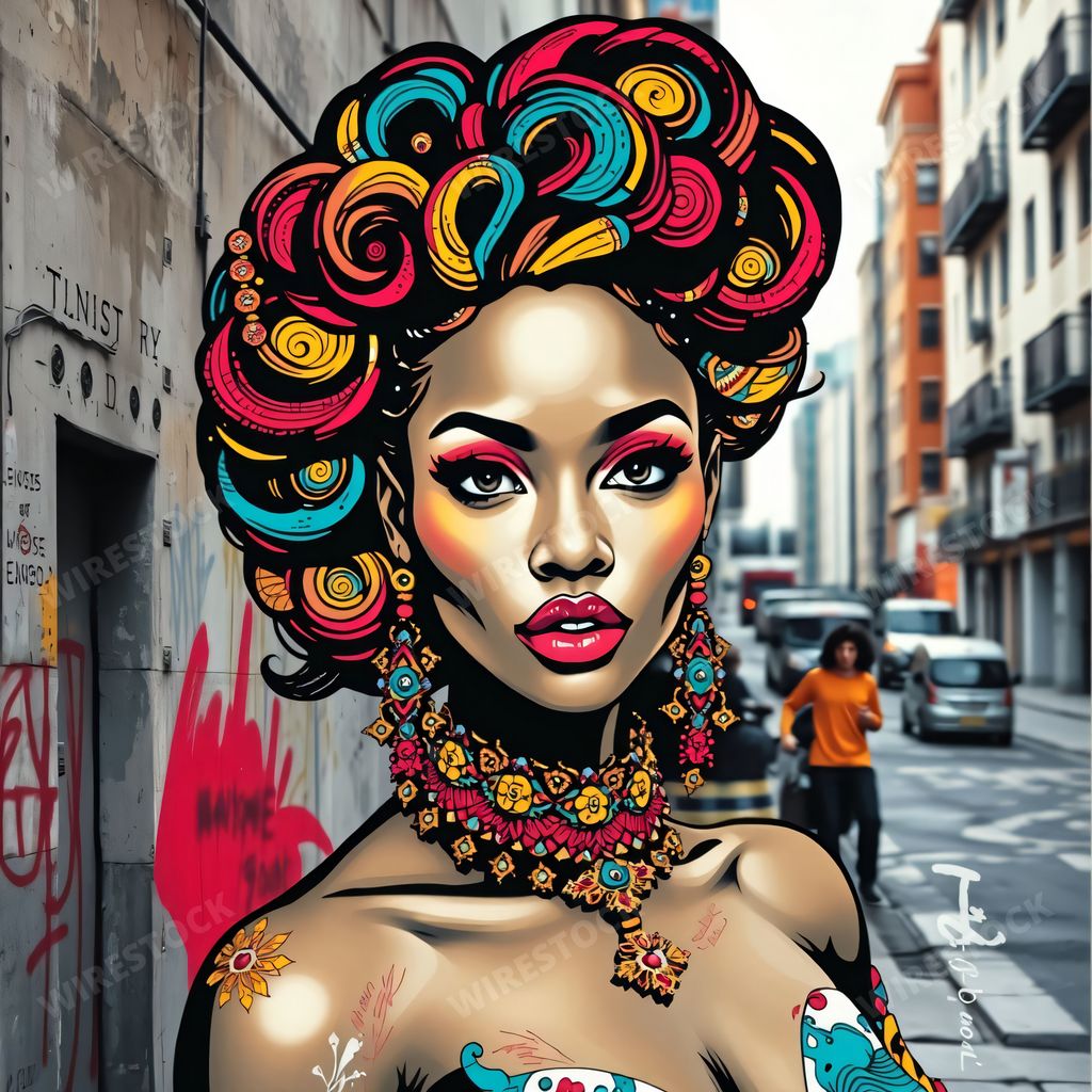 Rain Patterson | Vibrant street art mural of a woman in a city.