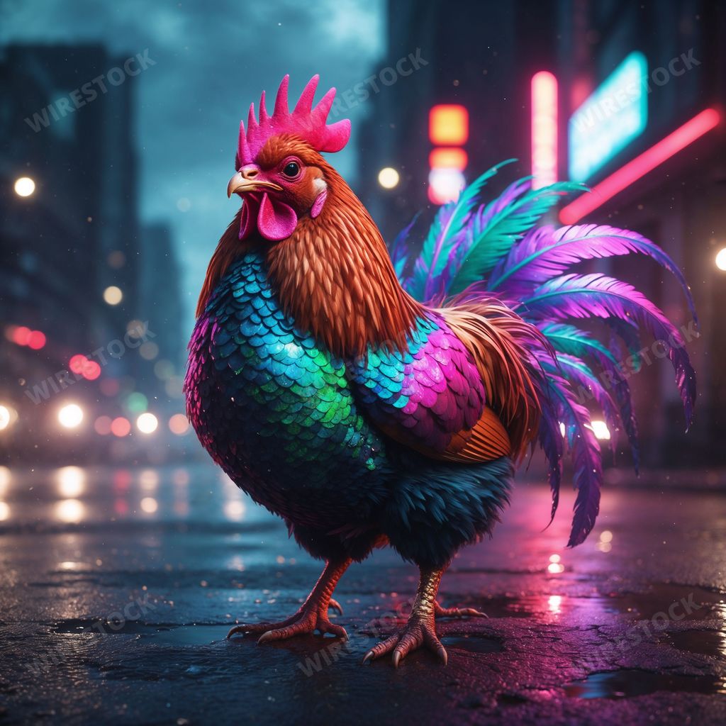 Amy in RL | Vibrant rooster on neon-lit city street at night.