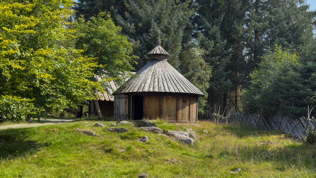 Media type: PhotoDescription: A rustic wooden hut in a lush forest setting, surrounded by trees and grass, under a clear blue sky.
