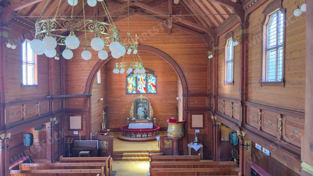 Caption:: Interior of Olden Kyrkje, Olden, Norway.