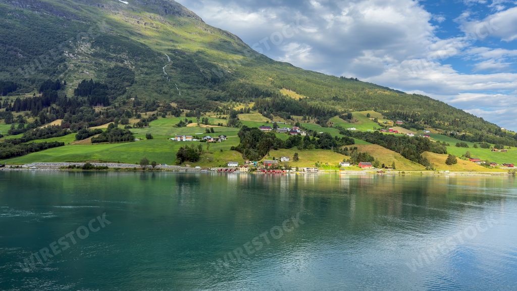 Tezels on the Road | Tranquil fjord with lush green hills and houses.