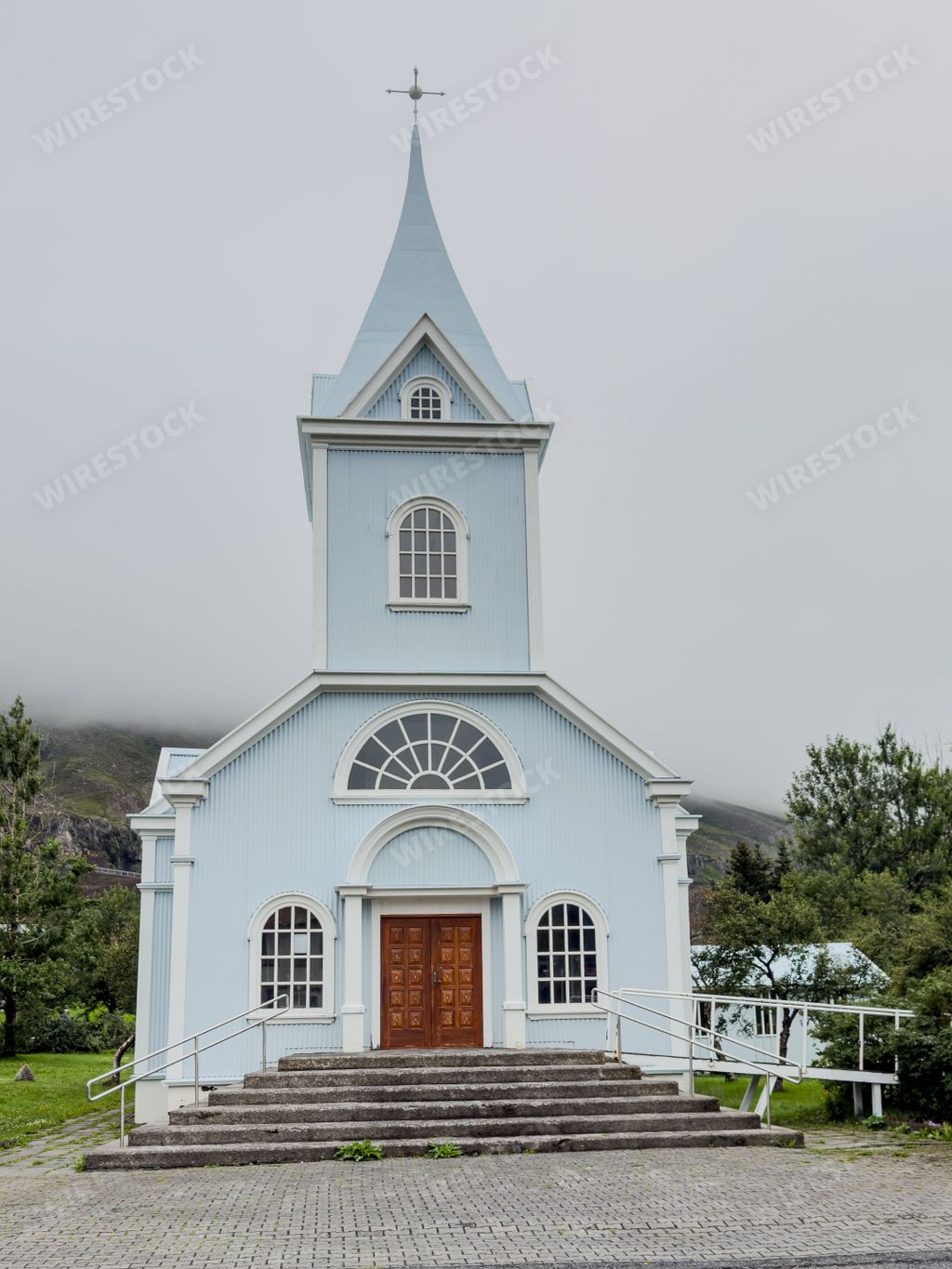 Media type: PhotoDescription: A charming blue church with a pointed steeple and wooden door, surrounded by greenery under a cloudy sky in a rural setting.