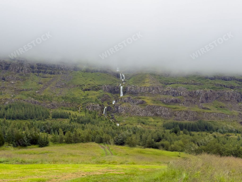 Media type: PhotoDescription: A misty landscape featuring a cascading waterfall on a lush green mountain with dense forest below, creating a serene natural scene.