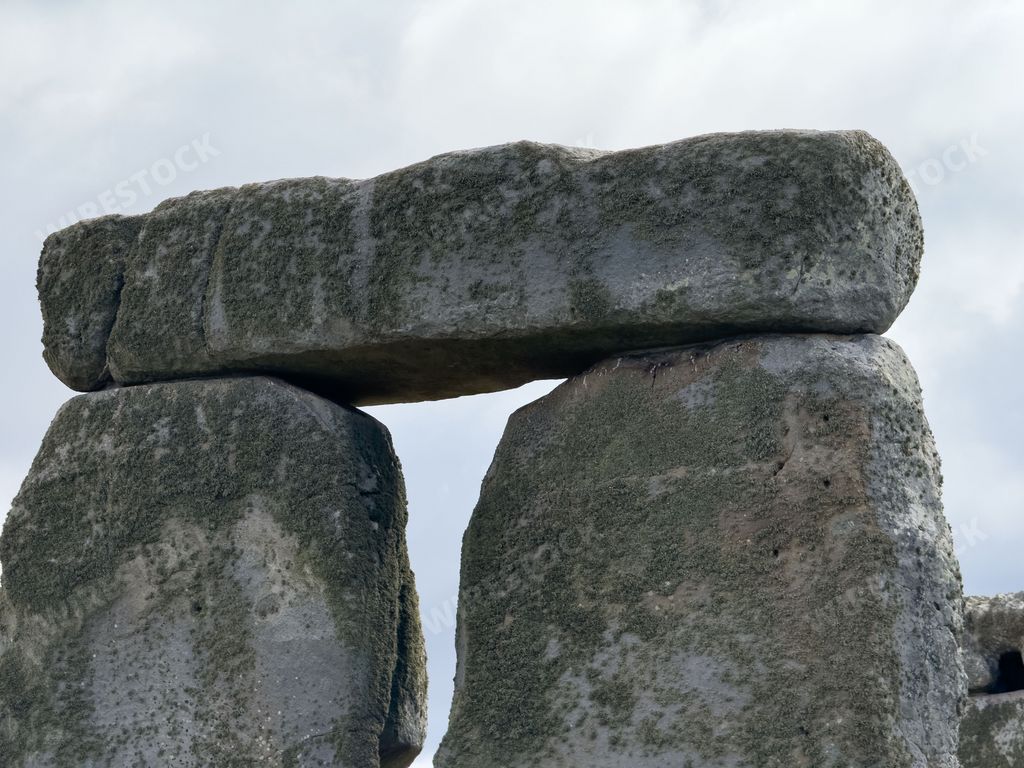 Media type: PhotoDescription: Close-up of Stonehenge stones against a cloudy sky, showcasing the ancient structure's texture and detail.