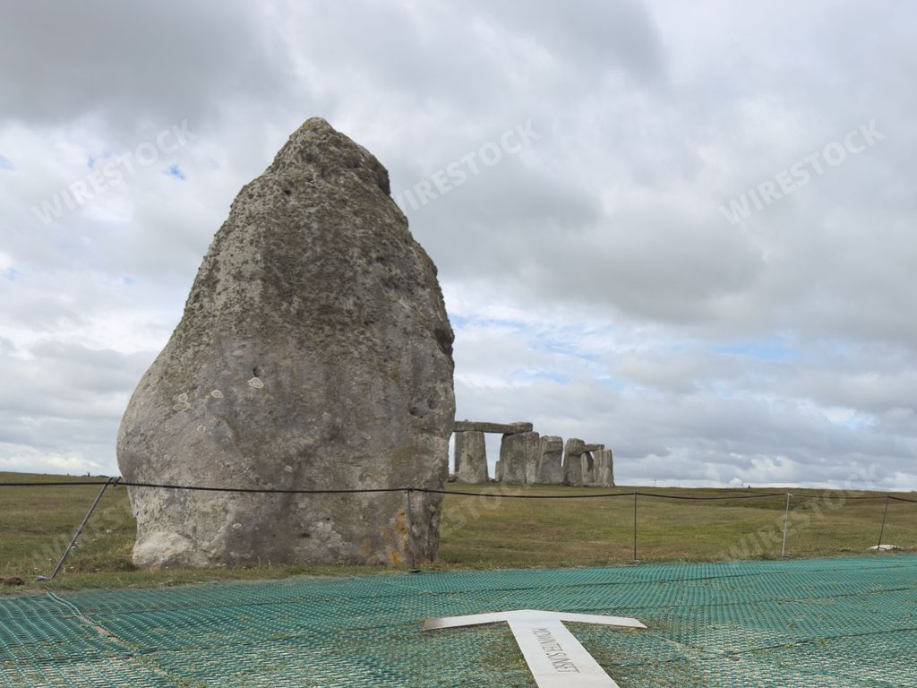 Media type: PhotoDescription: A view of Stonehenge with a large standing stone in the foreground under a cloudy sky in Wiltshire, England.