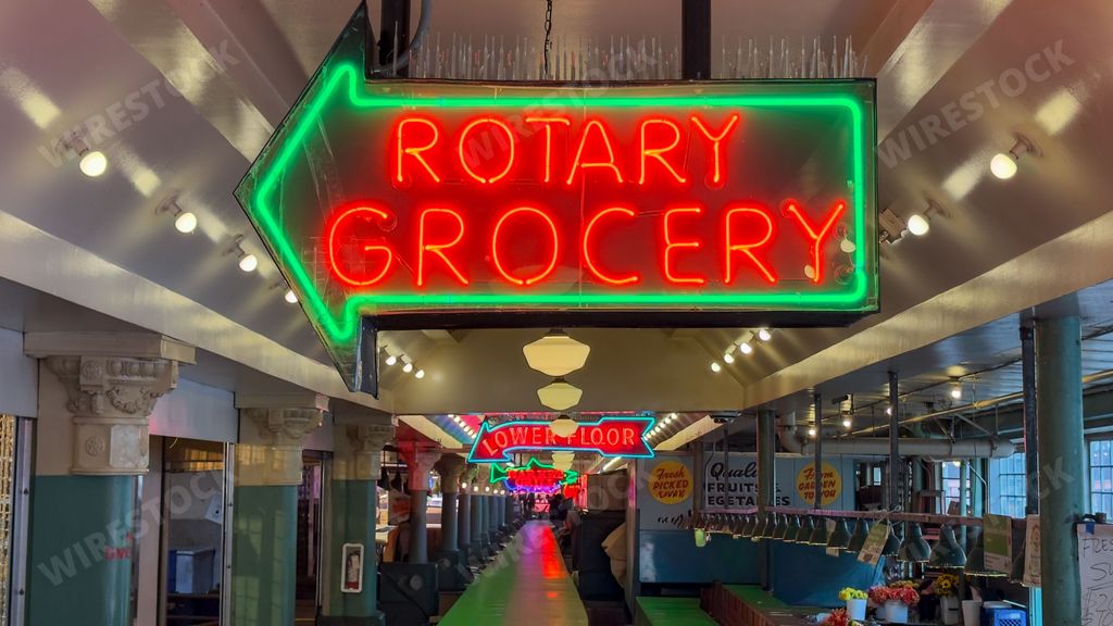Caption:: Neon signs inside Pike Place Market, Seattle