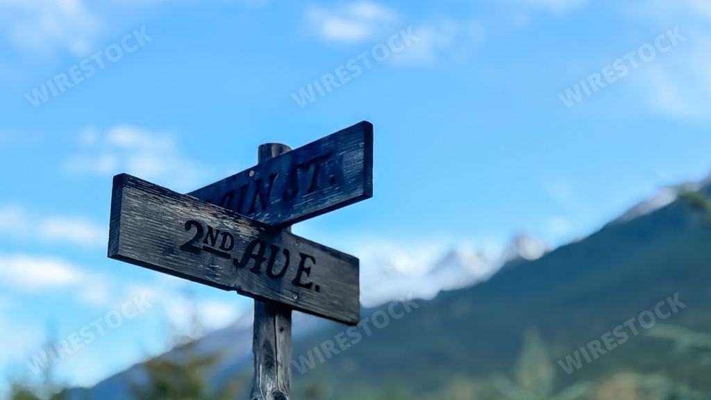 Media type: PhotoDescription: Wooden signs for Main Street and Second Avenue with snow capped mountains and blue sky in Dyea Alaska
