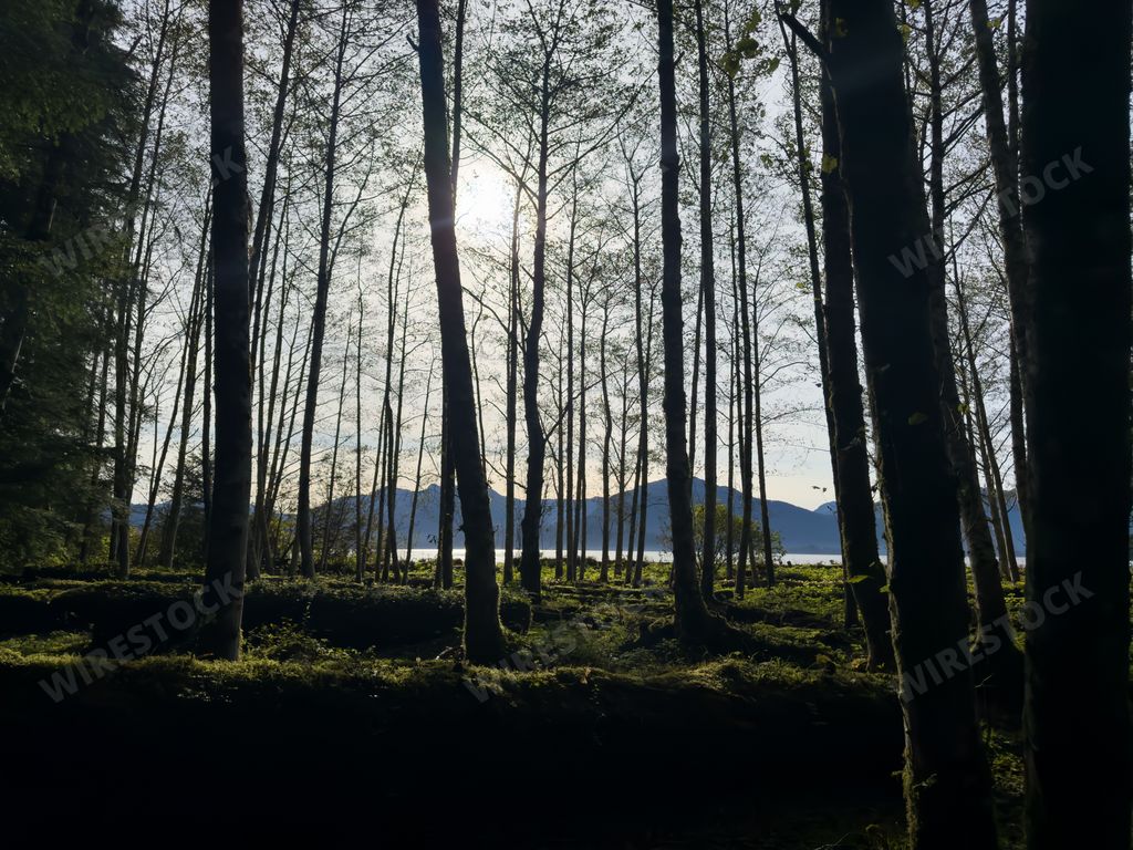 Caption:: Sunlight filters through Sitka’s forest canopy along the peaceful Totem Trail.