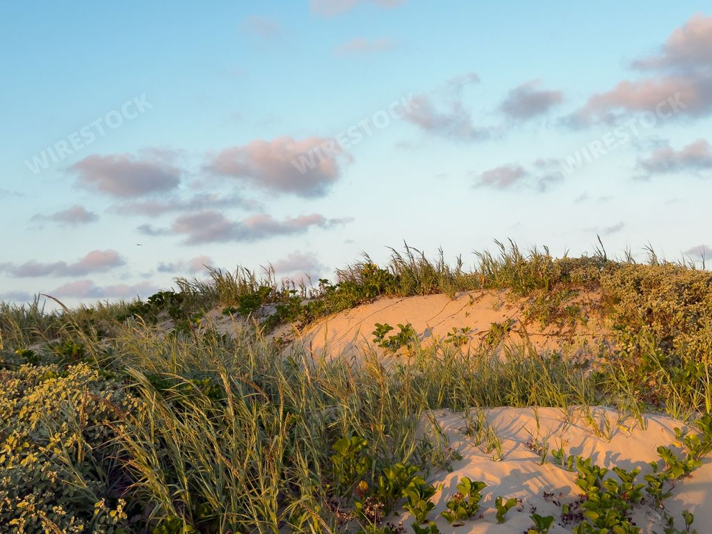 Tezels on the Road | sunrise light over sand dunes and coastal plants at south padre island with soft clouds in the sky