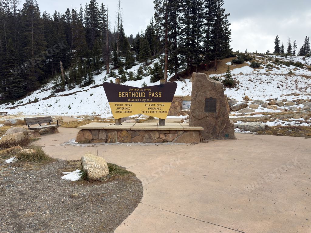 Media type: PhotoDescription: Snowy high mountain pass with sign marking the continental divide surrounded by trees rocks and benches