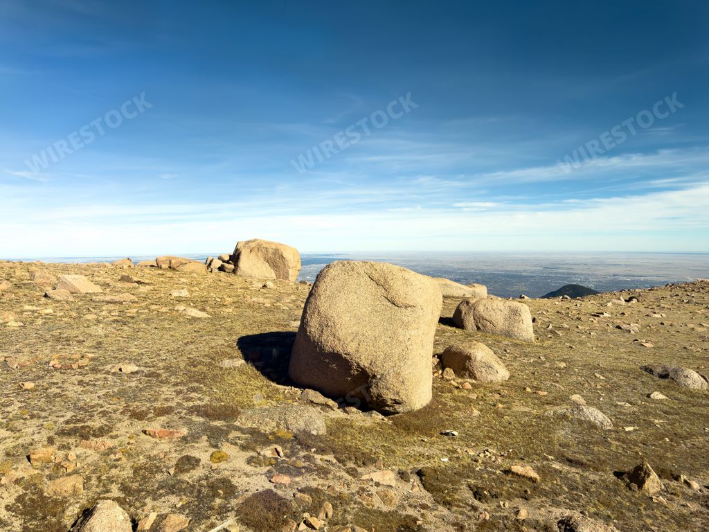 Media type: PhotoDescription: Large granite boulders rest on the alpine tundra near the summit of Pikes Peak with plains visible in the distance